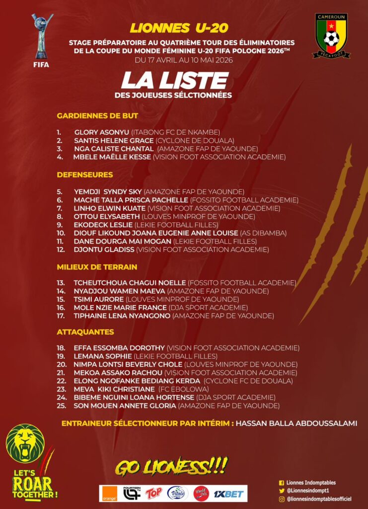 le sélectionneur Hassan Balla a communiqué les noms des 25 joueuses appelées à prendre part au stage préparatoire du dernier tour qualificatif de la Coupe du Monde Féminine U20 de la FIFA. Cette étape marque un tournant dans la préparation des Lionnes U20, résolues à décrocher leur ticket pour la phase finale.